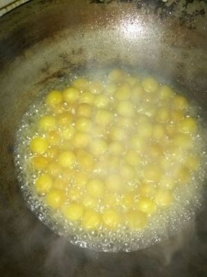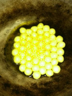 将所有元宵倒入锅中用中小火炒至表面稍微有点脆(时间长短决定元宵柔软度,可根据个人的喜好)然后把兑好的糖水倒入锅中烧至大约五分钟即可