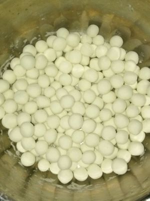 将糯米面倒入盆中,倒入适量的开水用筷子搅拌至可以将面搓成一个个大小均匀的元宵将成型的元宵放入一个盛器撒少许小面粉摇晃片刻至元宵表面占上小面便于下锅后不占锅