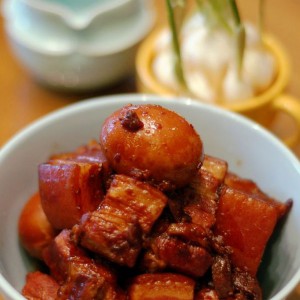 猪肉切成方块,清水浸泡滤去血水。鸡蛋煮熟剥壳。