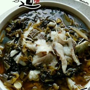 成品。酸菜汤淋入鱼片,爆鱼的油淋入鱼片,最好下面用一个漏勺接住哦,油中的渣渣一起倒到菜中就不美腻了。