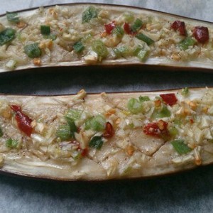 茄子去头去尾,洗净,从中间切成2半,用刀把里面的肉划出纹路,方便入味。