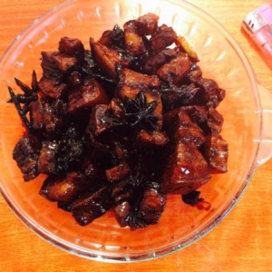 凉油,下入八角桂皮爆香,放入五花肉煎到四面金黄后,放入剩下所有调料。翻炒到上色均匀 糖融化后,倒水没入肉 小火炖1小时 ,大火收汁。