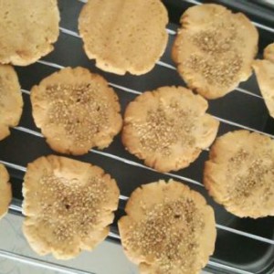 烤箱提前预热180℃ 5分钟,把面团分成栗子大小的小面团,摆放在烤盘上,用手按压然后撒上芝麻!入烤箱180℃ 18分钟!