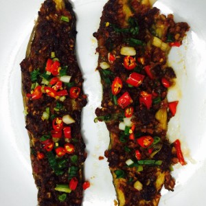 取出烤好的茄子将香葱碎和辣椒碎洒在上面上烤箱180度5-8分钟
