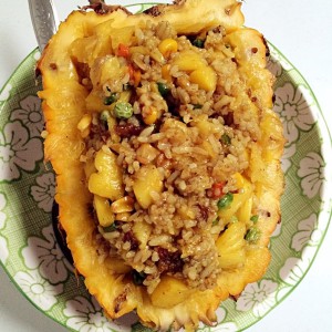 将菠萝丁、刚才的食材和熟的米饭(最好是剩饭,更好吃一些)加入适量咖喱,烩炒。炒好后盛在菠萝碗里。