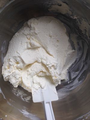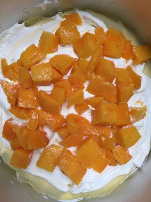 饼皮冷藏的时候开始打发奶油,七八分发就好。奶油打好后暂时放入冰箱冷藏,开始切芒果。
