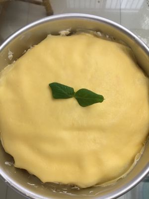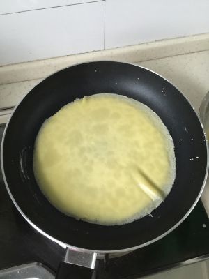 接下来就可以用平底锅摊饼皮了,26cm的平底锅做八寸的话这些量可以摊10张左右。一般第一张气泡会多一点,接下来就会好很多。饼皮摊好后放入冰箱冷藏20-30分钟。