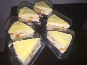 芒果切好,饼皮和奶油从冰箱拿出,准备好八寸的活底模,现在可以开始涂奶油和放芒果了,一层饼皮一层奶油,铺两三层后可以开始放芒果,如此反复铺下去。