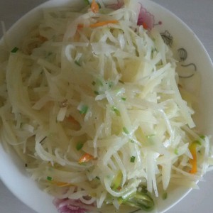 土豆丝,辣椒丝一起炒至变色,淋上醋,翻炒均匀,撒上葱花出锅