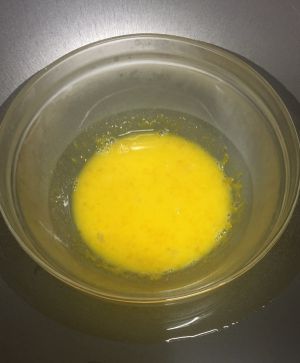 待蛋液冷却后加入少量打好的奶油搅拌均匀到无颗粒。然后把剩下的奶油一起倒入搅拌。要没有颗粒才可以哟!
