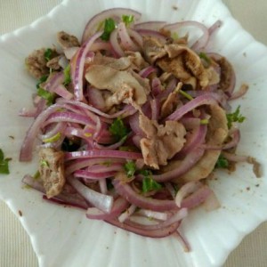 两种原料放铁板烧上或平底锅上煎熟,羊肉变色,洋葱稍软即可。