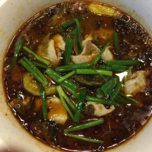 酸菜鱼出锅后洒上葱段,另起油锅加少量油,油全热后浇在酸菜鱼上,简单的酸菜鱼就做好了