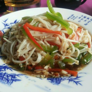 将材料洗干净,辣椒切丝,蒜切末!将水烧开炒熟金针菇撩出过凉水!