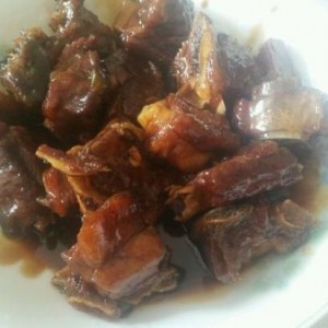 将炖好的排骨放入锅内翻炒,记住要热锅凉油下锅,炒到略微变色,倒入糖醋汁,这里糖醋汁可以加入之前的排骨汤,让白糖化进汁里,加入糖醋汁