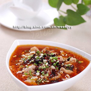 锅里从新加入2中炸好的香油3匙,加入剁碎的郫县豆瓣,小火慢慢炒至出红油,放入切碎的蒜,姜片,少许辣椒花椒爆香,加入高汤,熬开后,把1中腌好的肉放入,划散,煮开锅即可。倒入铺了白菜的碗中。然后把2中炸香油剩余切碎的辣椒花椒和剩余的蒜碎放在上面。锅里从新倒入剩余的香油,加剩余的辣椒花椒小火爆香,浇在碗里即可。撒上少许香葱碎点缀。