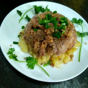 蒸熟后便可以起锅。用选用的盘子放在上面,再倒扣,拿掉铁盆。撒上葱花