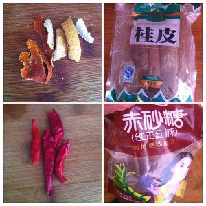 干辣椒,陈皮,桂皮,柚子皮,红糖炒色。
