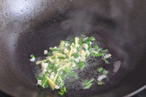 炒锅放适量油,加入姜蒜葱花末,爆香