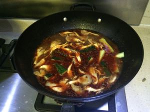 用水煮肉料也行用豆瓣酱也行 放油放豆瓣酱锅里炒开(我用的豆瓣酱)然后放入热水煮开(这个时候煮开可以尝一下味道 如果咸就在加点水)开了之后放入青瓜 蘑菇 绿豆芽 娃娃菜煮 菜煮熟捞出来放碗里 然后把牛肉放进去煮 牛肉全部变色就捞出来盖在青菜上