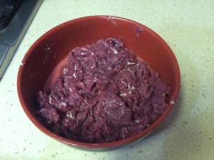 把牛肉切片 放两汤勺生粉 三分一汤勺盐 和三汤勺料酒 抓匀后腌制一个小时
