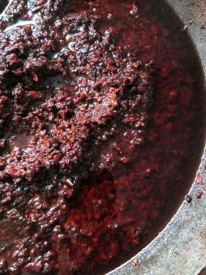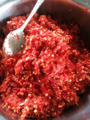 下入辣椒碎翻炒不要停防止糊锅 炒至出红油