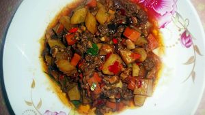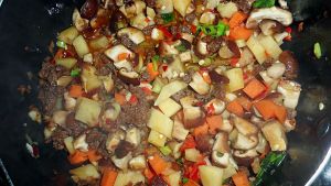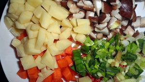 土豆香菇胡萝卜全切粒!辣椒剁碎,葱切了,还有姜碎