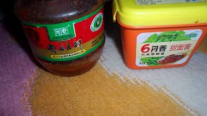 加入牛肉炒熟,加入辣椒,炒辣味出来了再加入豆瓣酱,甜面酱,翻一下,再加入香菇,土豆胡萝卜,翻炒一会!加半婉清水中火闷到汁变少,加葱姜!