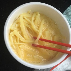 土豆切丝,建议用小一点的土豆,我做的时候家里的土豆大概和爱疯5差不多大,然而做两人份还是多了。切丝之后放在水里防止氧化,之后煮开水放进去稍微煮一煮即可。