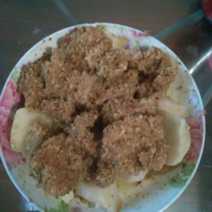 买的五花肉切片 芋头削皮洗干净 芋头放盘底 切好的五花肉加入粉蒸肉包 (超市有卖的那种 调料包和粉包都当进去 拌匀) 调好的五花肉放芋头上面