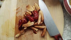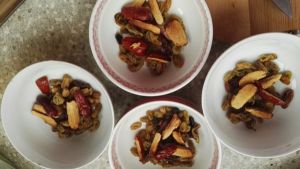 把泡好的红枣切成小块,把葡萄干、花生仁、西瓜子仁控干水分备用。