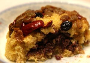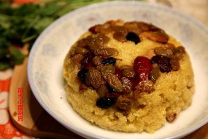 把炒好的黄米饭盛入刚才铺好葡萄干等的碗里,盛入少半碗,盖住葡萄干等。
