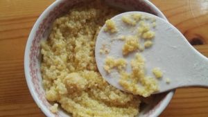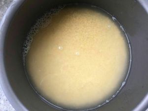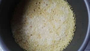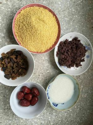 把黄米淘洗两遍,放入电饭锅,添适量水,比平时蒸米饭的水要稍多一些,蒸熟,水多一点是为了让黄米更软糯一些。