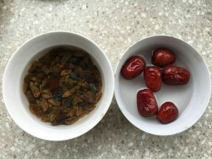 把红枣和葡萄干、花生仁用温水泡开洗净。