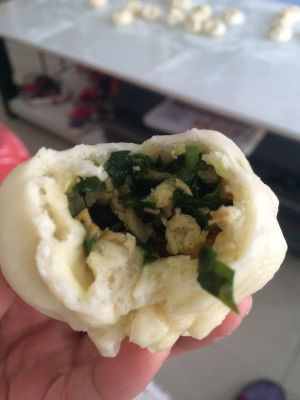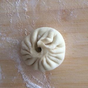 3、发好的面揉好面团擀成面皮,包馅捏成褶皱,放10分钟左右,上锅蒸,