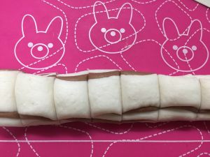五个小面团分别揉成长条,稍稍压扁后叠合在一起