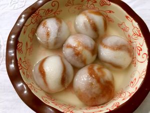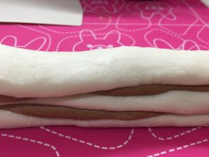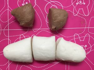 糯米粉放在容器里,温水一点点倒入,揉成光滑面团。取出三分之一加入可可粉揉光滑。白面团分成三份,可可面团分成两份。