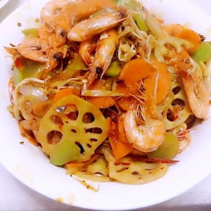 倒入麻辣香锅底料,将虾,藕片,莴笋,洋葱,胡萝卜,金针菇等配菜放入,喜欢吃辣的在放入少许辣椒丝。倒入少许水,一直翻炒,至收汁,撒一点点盐滴入一两滴麻油即可。