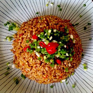 把调好的碗汁烹入锅中,翻炒均匀就可以出锅了。出锅之后撒上小香葱,美味的炒饭就完成了