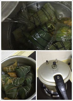 将包好的粽子依次排放在高压锅中。然后再加入水,正好和粽子持平,盖上锅盖,大火煮25分钟就OK啦!