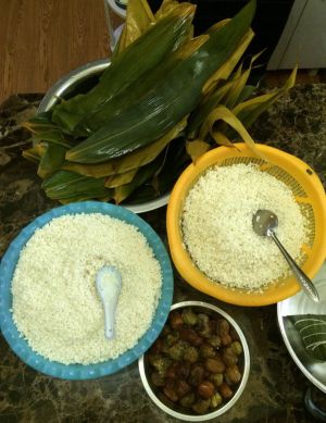 准备好所有材料。(糯米要提前浸泡3-4个小时;泡好沥干水后要加点玉米油,这样煮好的粽子吃起来很糯,口感好)