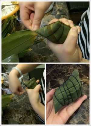 拿一张粽叶用大头的一端窝成一个三角漏斗状(尖部要紧闭,以防漏米)。