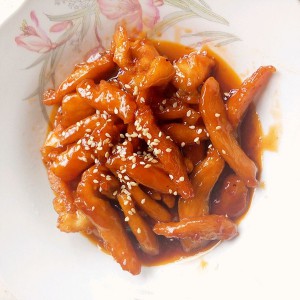 锅里放油热了之后放入番茄酱炒出红油,接着放入芡汁炒到冒泡泡,就赶紧倒入炸好的肉条,翻炒直至肉条都裹上了红汁就可以出锅了!撒点芝麻点缀更好!