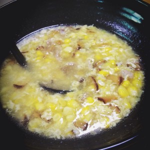 锅里加足够的水,水开后,加入适量油,下玉米粒和冬菇丝,再次滚起后加入瘦肉丝和韭黄粒,滚一会儿加入适量盐,加入打散的鸡蛋(鸡蛋要慢慢走圆形倒,不要一下子全倒进去)