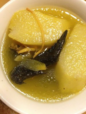 仨物加姜片入锅 一次性注入足够水量开始煲吧 这里有个小秘诀:淮山要斜刀切 这样煲好久纤维都不会煲糊掉 而且一口入嘴却还是软绵的(之前朋友请喝淮山汤 却不见淮山物 全部烂掉汤底去了 你懂得呵)