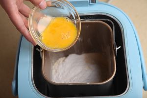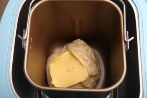将除黄油、全蛋液外的所有材料放入面包机内,开启和面程序和成面团,