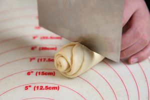 取其中5份,分别擀成圆片,每5片一组卷起来,用刀当中切开变成两朵玫瑰花,