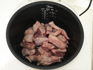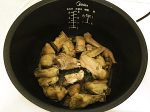 将鸡肉摆放到电饭锅中。