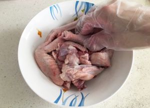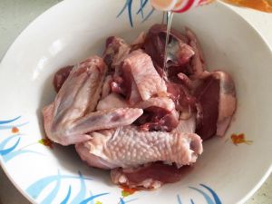 用手将酱油、料酒和盐跟鸡肉混合,轻轻按摩一会。