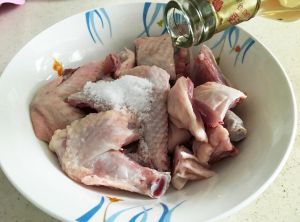 处理好的鸡肉中加入酱油、盐和料酒。