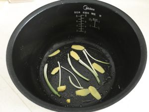 电饭锅底部涂油,铺上葱白和生姜。